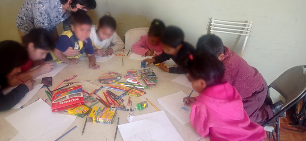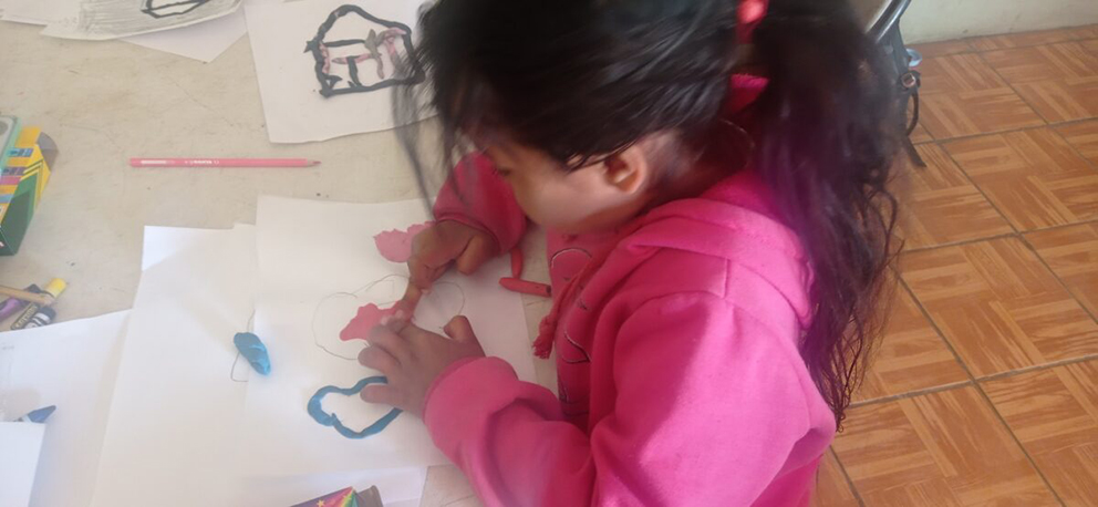 Niñas y niños pintan su historia que hace parte de la serie “Dibujando mi realidad, niñez indígena”, en el refugio del estado de Chihuahua. Foto: Patricia Mayorga.