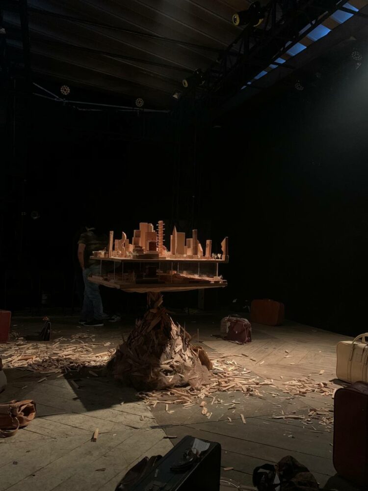 Una habitación llena de maletas, escombros y una maqueta enorme donde se muestra el diseño de varias torres de departamentos aparecen en la escena. Mientras tanto, en el escenario aguardan tres personajes: una ingeniera con intenciones de ganar dinero, un guía de turistas que vivía en el barrio y un arquitecto que duda del proyecto por lo que significará el desalojo masivo del vecindario donde buscan construir estos grandes edificios de concreto ¿qué pasará?