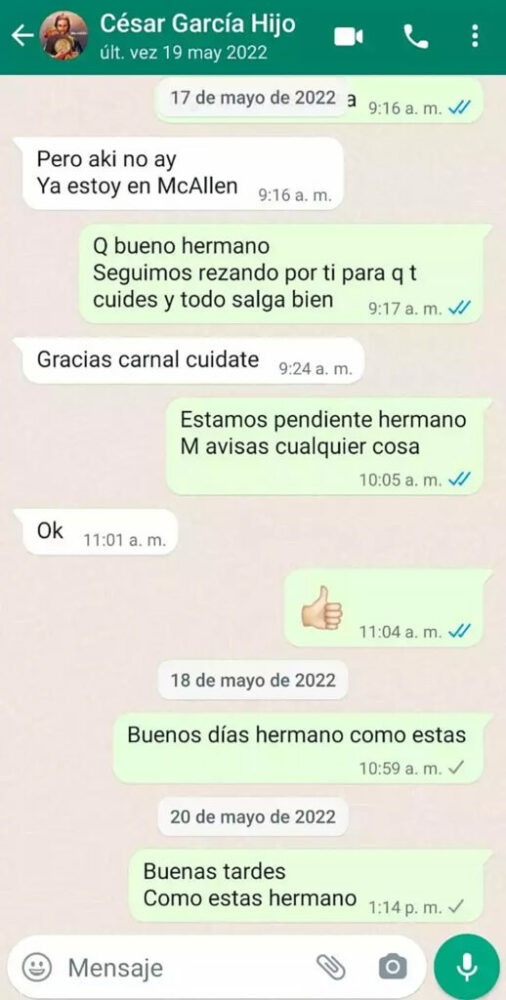 Cesar logró llegar a una bodega en McAllen, ahí se escondió y esperó. Los traficantes de personas solo les daban de comer agua y pan, también les quitaron los teléfonos. Fue la última vez que Jesús y Cesar tuvieron contacto.