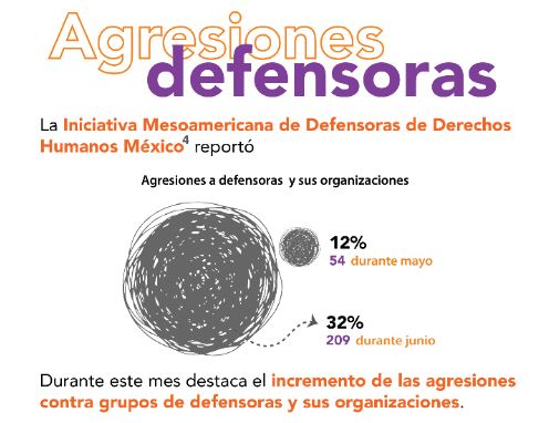 Esta iniciativa ha reconocido al igual que CIMAC que la violencia en espacios digitales hacia las mujeres defensoras y periodistas va en aumento. Reportan que las agresiones a defensoras y sus organizaciones pasó de 54 (12%) en el mes de mayo a 209 (32%) en junio. Este incremento significativo muestra que las defensoras y organizaciones que son agredidas trabajan por el derecho la verdad justicia y reparación en un 21%, los derechos de las mujeres en 20%, periodistas que defienden el derecho a la libertad de expresión y la información, así como defensoras de la tierra y el territorio de los bienes naturales en 17% de los casos.