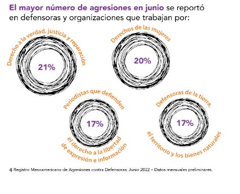 En tanto, las agresiones hacia mujeres defensoras pasaron de 54 en el mes de mayo de 2022 a 209 en junio.