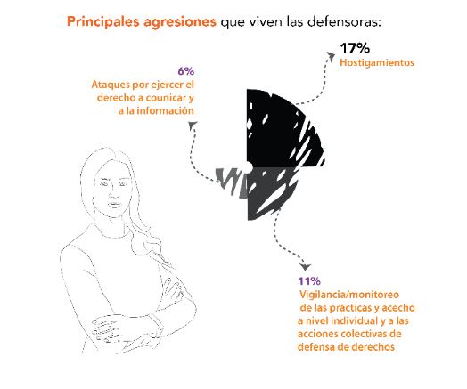 Las principales agresiones que viven las defensoras son 17% hostigamientos, 11% vigilancia, monitoreo y acecho a nivel individual, así como en colectivo de las labores de defensa que realizan; 6% de los ataques se perpetraron por ejercer el derecho a comunicar y a la información.