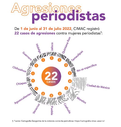 Comunicación e Información de la Mujer (CIMAC) registró 22 casos de agresiones cometidas en contra de mujeres periodistas tan sólo en el segundo trimestre del año 2022. La Ciudad de México se posiciona como la entidad con mayor número de ataques, le siguen Morelos, Coahuila, Veracruz y Puebla. Funcionarios estatales, particulares, así como funcionarios municipales y usuarios de redes sociales son los principales agresores.