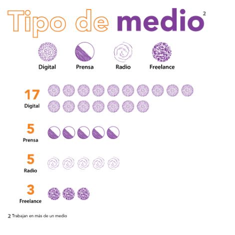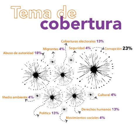 De las agresiones reportadas 17 fueron cometidas en contra de reporteras que trabajan medios digitales, en prensa y radio recibieron cinco agresiones, tres más fueron perpetradas en contra de periodistas freelance y dos trabajan en más de un medio. temas de cobertura por los cuales fueron agredidas las periodistas son en su gran mayoría corrupción 23%, el abuso de autoridad 18%, derechos humanos, coberturas electorales y política 13% y, por último, medio ambiente, migrantes, seguridad, cultural y movimientos sociales 4%.