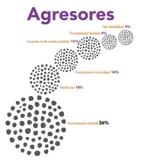 Respecto a quienes son los agresores se muestra que el 36% de los ataques se dieron por parte de funcionarios estatales, 18% por un particular, 14% por funcionarios municipales y usuarias y usuarios de redes sociales, 9% funcionarios federales y sin especificar. En cuanto al tipo de violencia se identifica en primer lugar la psicológica, después la física y en línea.