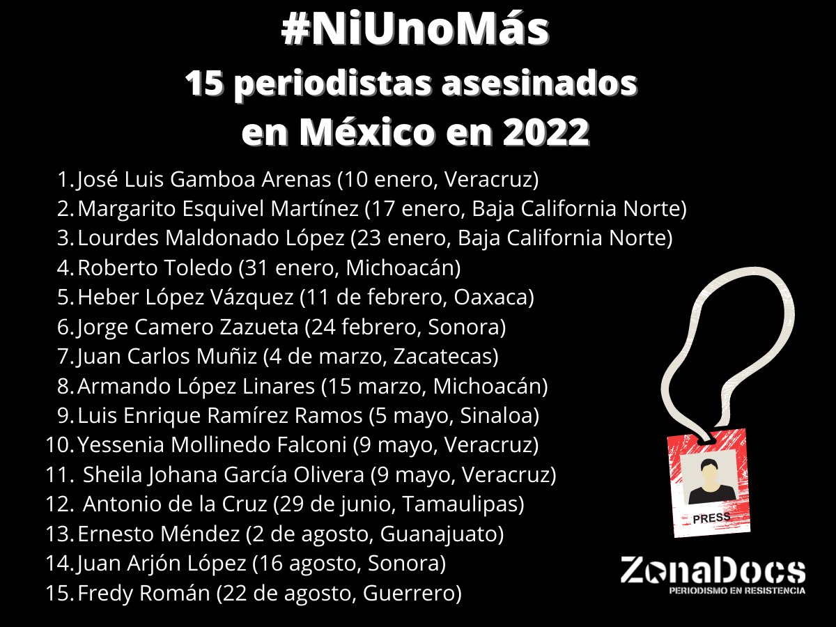 A la muerte de Fredid Román este 22 de agosto, se suman la de Juan Arjón, 16 de agosto; Ernesto Méndez, 3 de agosto; Antonio de la Cruz, 29 de junio; Yesenia Mollinedo, 9 de mayo; Sheila Johana García, 9 de mayo; Luis Enrique Ramírez, 6 de mayo; Armando Linares, 15 de marzo; Juan Carlos Muñiz, 4 de mayo; Jorge Camero Zazueta, 25 de febrero; Heber López Vásquez, 10 de febrero; Roberto Toledo Barrera, 31 de enero; Lourdes Maldonado, 23 de enero; Margarito Martínez Esquivel, 17 de enero y José Luis Gamboa Arenas, 10 de enero.