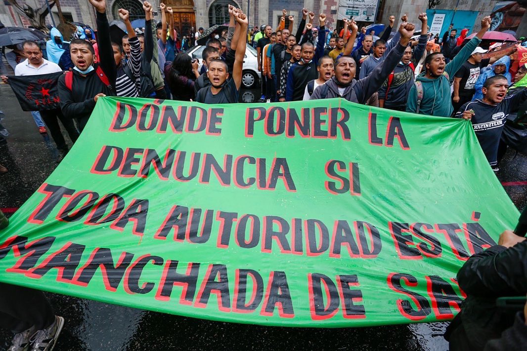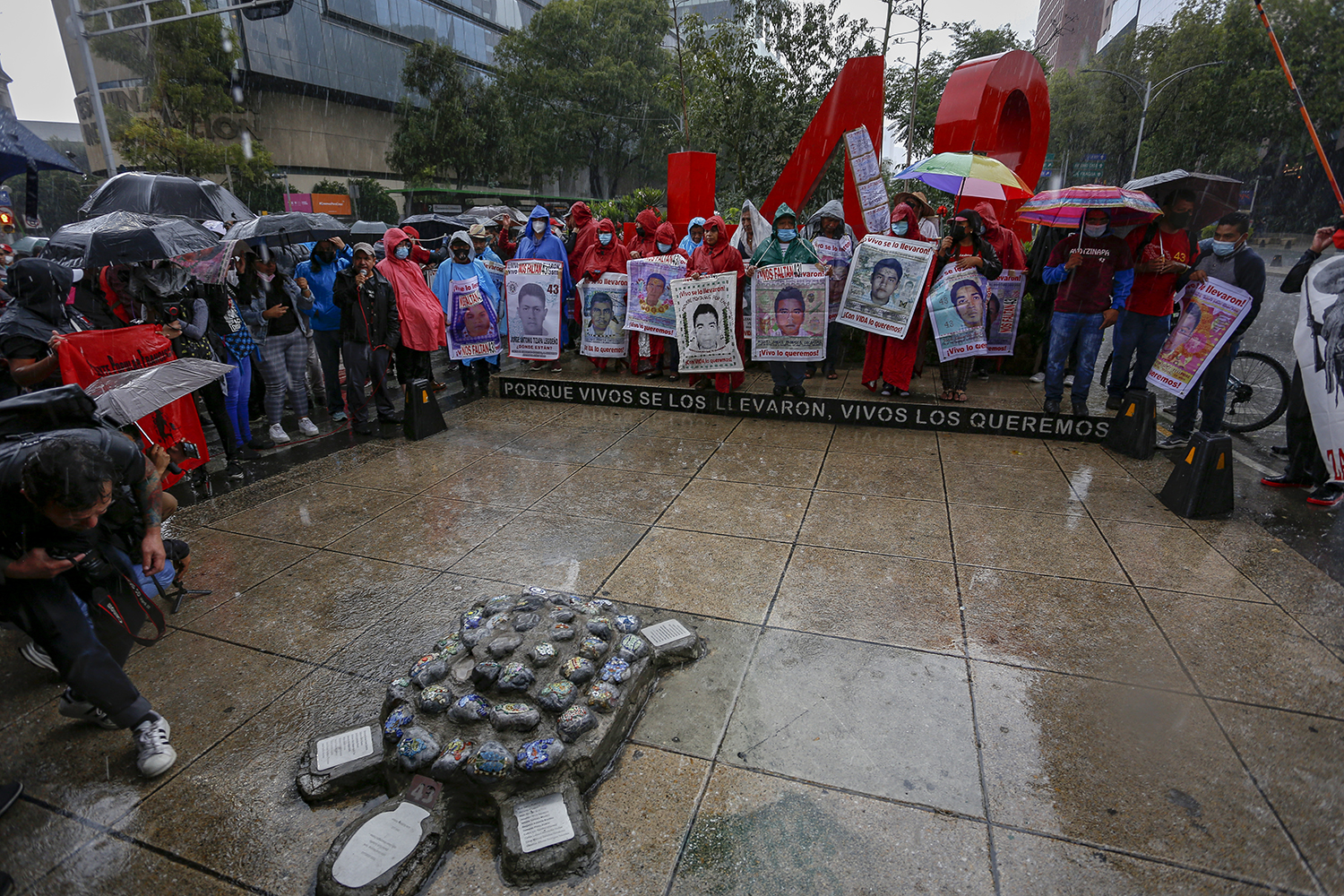 A pesar de la fuerte lluvia que azotó la Ciudad de México (CDMX), la marcha avanzó por la avenida Reforma para llegar al Antimonumento +43, donde realizaron un pase de lista.