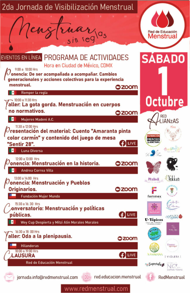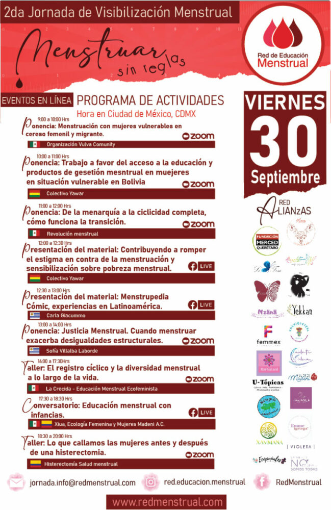 Del 29 de septiembre al 1 de octubre, la Red de Educación Menstrual llevará a cabo la Segunda Jornada de Visibilidad Menstrual 2022, donde se invita a todas las mujeres y personas menstruantes a participar por la dignidad menstrual, educación e inclusión de todas las personas que atraviesan este proceso.
