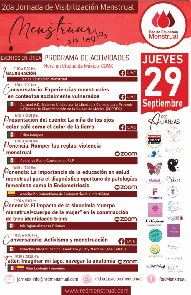 Y para las personas que quieren ir, pero no pueden pagar la cuota de acceso, se les invita a seguir todas las actividades en la página de Facebook de la Red, ya que ahí se transmitirán los conversatorios, la presentación de materiales y los videos que forman parte de la Segunda Jornada de Visibilidad Menstrual 2022