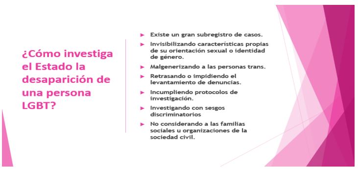 Entre ellas, destacaron criterios como: la efectividad y exhaustividad; la debida diligencia; el enfoque diferencial y especializado; el enfoque humanitario; la gratuidad; la igualdad y no discriminación; el interés superior de la niñez; la máxima protección; la no revictimización; la perspectiva de género; la presunción de vida; la verdad; y la participación conjunta, este último criterio, el que más ha costado a organizaciones y familias de la comunidad LGBTTTIQ+.