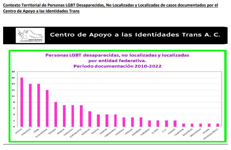 Aunado a ello, denuncian que, las mujeres trans son más víctimas de este delito, representando el 66.13% del total de casos, le sigue la población homosexual con un 17.74%; la población lésbica con un 12.10%; y los hombres trans con un 4.03% del total. Jalisco, Veracruz, Baja California, Sinaloa y la Ciudad de México, son las entidades donde hay un mayor número de reportes de desaparición de mujeres trans.