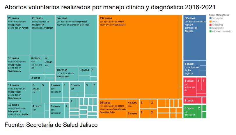 “En Guadalajara, Zapopan y Tlajomulco no cuentan con un expediente completo, a pesar de ser los municipios donde se registra mayor incidencia de casos” insistió y demostró que del total de los 594 abortos realizados de 2016 a 2021 en Jalisco, sólo se conoce cuál fue el manejo clínico que se practicó en los siguientes casos: