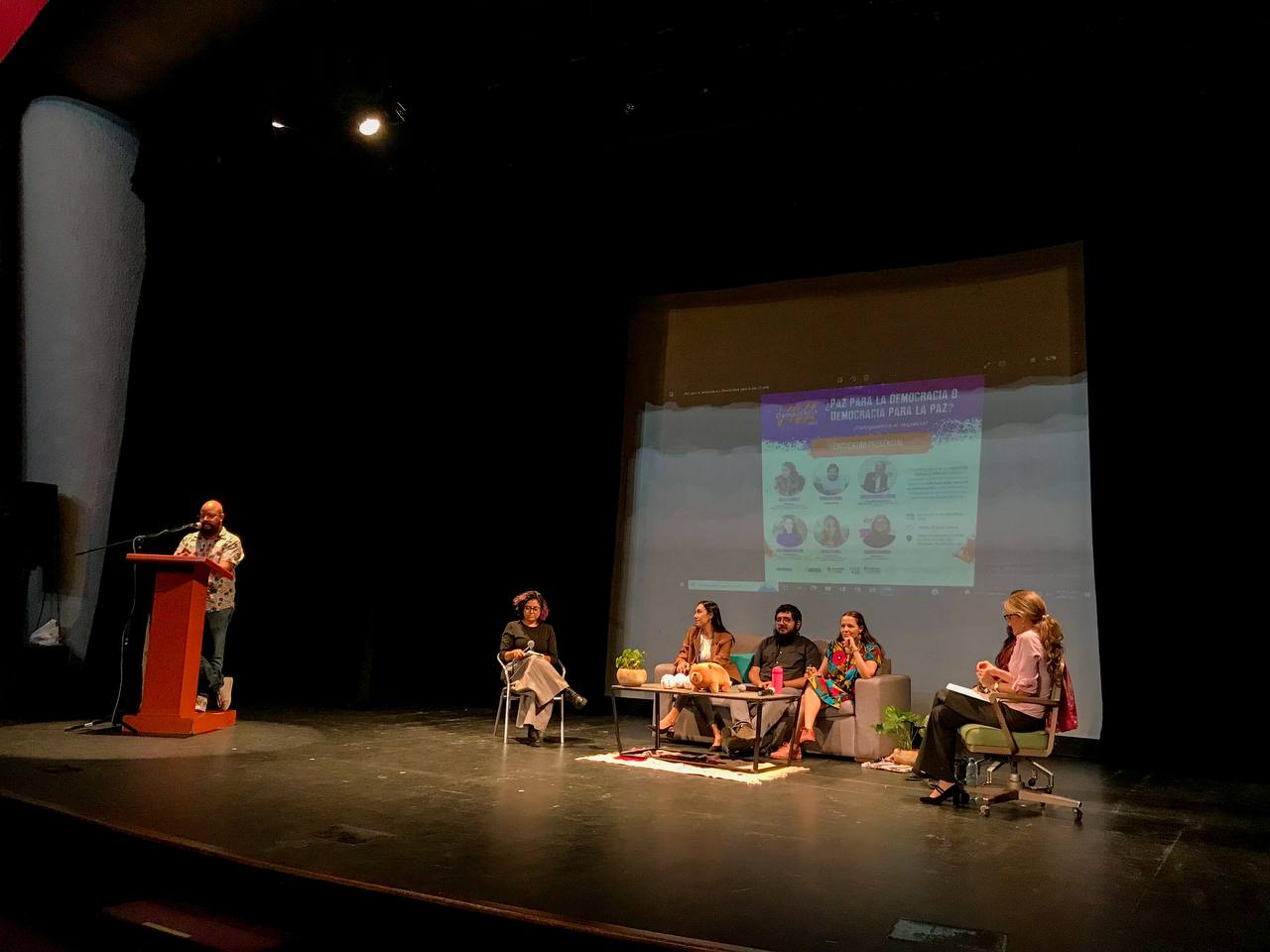 Enseguida de la intervención de la activista se les preguntó al panel, en general, ¿Democracia para la Paz o Paz para la Democracia? Sobre ello argumentaron Conrado Romo, miembro de Cocina Cívica, comentó: “Yo le daría la vuelta la pregunta, antes de la democracia es la política”.