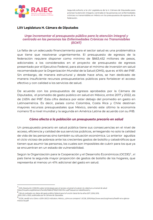 La exigencia del incremento al presupuesto fue presentada por la Red por la Atención Integral de Enfermedades Crónicas no transmisibles (RAIEC) en las inmediaciones del Palacio Legislativo federal frente a las y los diputados de la Cámara Baja. En dicho documento, del que PODER posee copia, se estipula que México se encuentra en déficit de gasto en materia de salud.