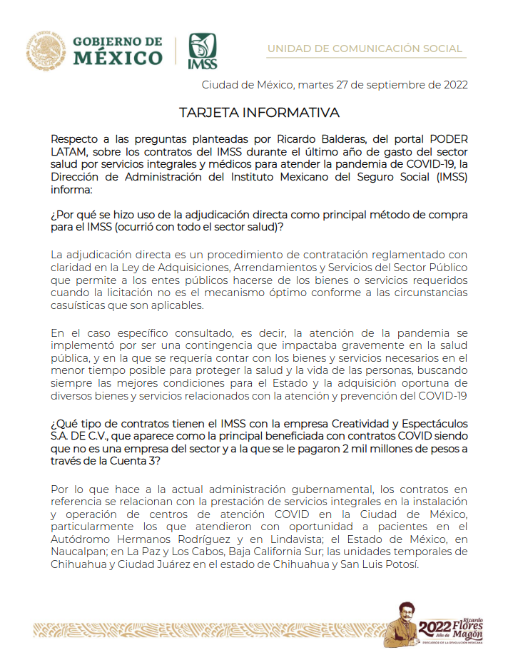 Respecto a los motivos de contratación, el IMSS explicó a PODER que se trata de un pago por prestación de servicios y operación de centros de atención COVID en la Ciudad de México, específicamente los que se encuentran ubicados en el Autódromo Hermanos Rodríguez y en Lindavista. Asimismo comentan que lo mismo ocurrió en el Estado de México, La Paz y Los Cabos, Baja California Sur y algunas unidades temporales de atención en Chihuahua, Ciudad Juárez y San Luis Potosí.