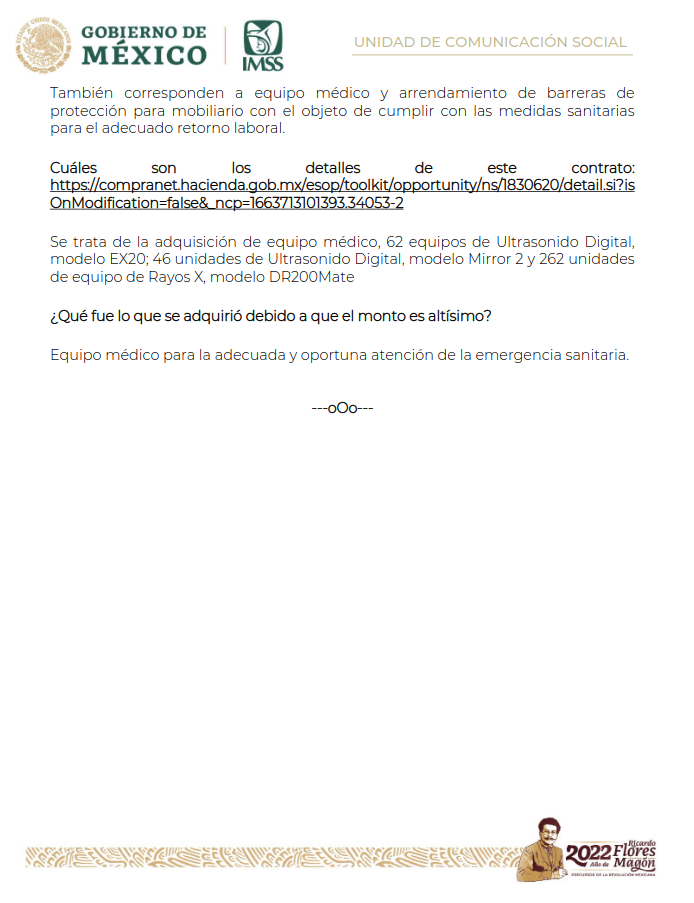 “Se trata de la adquisición de equipo médico, 62 equipos de Ultrasonido Digital, modelo EX20; 46 unidades de Ultrasonido Digital, modelo Mirror 2 y 262 unidades de equipo de Rayos X, modelo DR200Mate”.