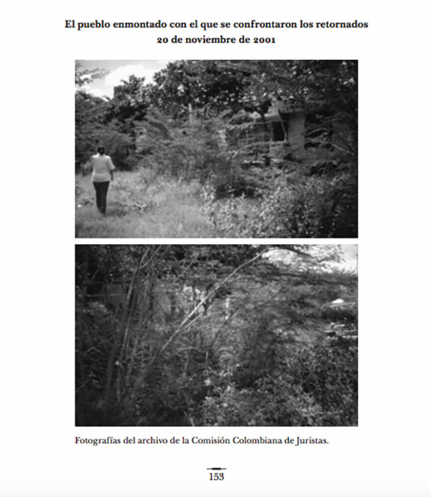 Algo que pasó y que me marcó mucho el camino del libro es que cuando estaba revisando el informe vi unas fotos de El Salado cuando las personas desplazadas regresaron a su pueblo y esas fotos eran unas veredas y unas casas comidas por la maleza, comidas por lo vegetal. Elles contaron que llegando tuvieron que desmalezar todo eso porque el monto se estaba comiendo el pueblo.