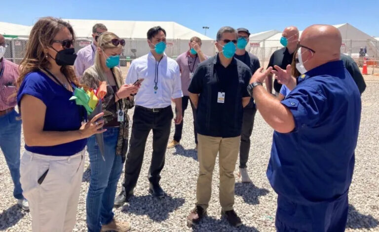 Verónica Escobar, representante demócrata por El Paso, a la izquierda, y Joaquín Castro, demócrata por San Antonio, al centro, inspeccionaron el refugio Fort Bliss para niños migrantes. Mayo de 2021. Fotografía: Cortesía del Departamento de Salud y Servicios Humanos.