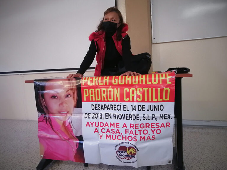 “Lamentablemente, el temor hizo que se callaran los rumores, pero estos señalamientos no son nuevos. Desde el 2012 se escuchaba de la conexión entre las policías y las desapariciones. Antes era un grito silencioso y hoy, por fin, está en el dominio público”, comenta Tere Castillo. Ella, desde 2013, busca a su hija Perla Padrón, desaparecida en junio de ese año junto a su esposo, José Alberto Gallegos. Ambos desaparecieron en el municipio de Rioverde.
