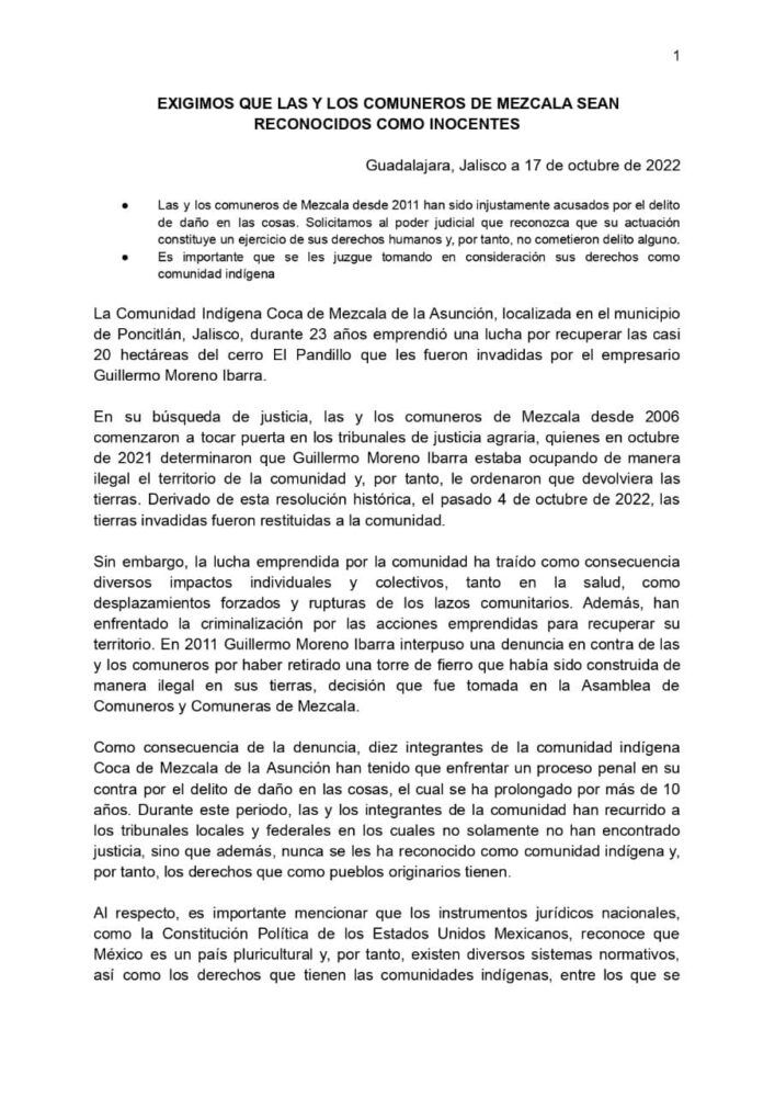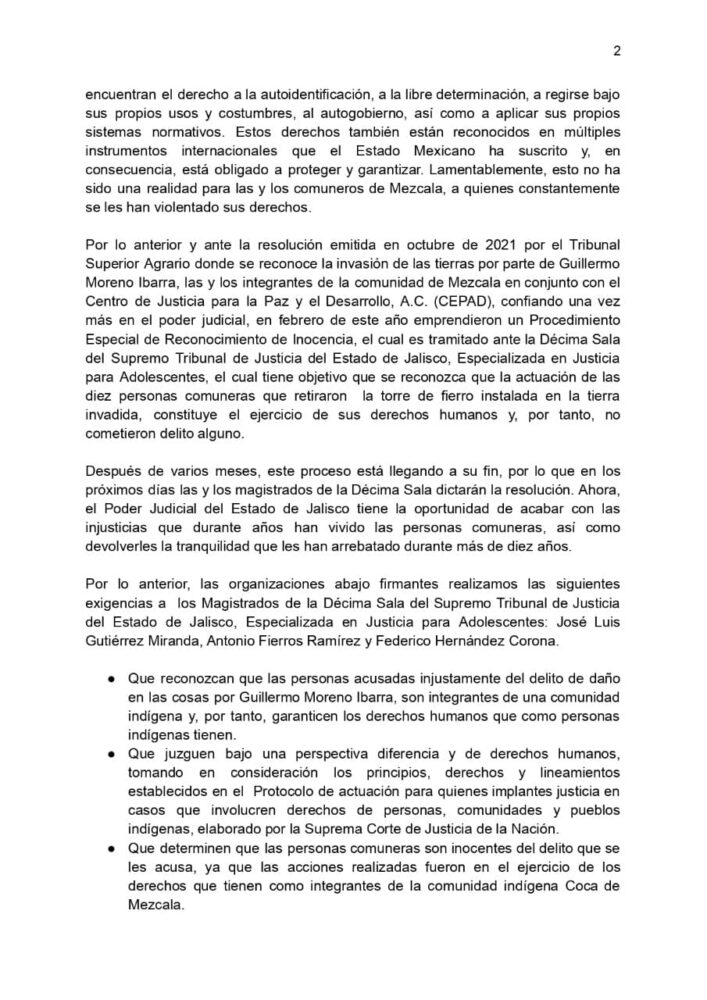- Determinen que las personas comuneras son inocentes del delito que se les acusa, ya que las acciones realizadas fueron en el ejercicio de los derechos que tienen como integrantes de la comunidad indígena Coca de Mezcala.