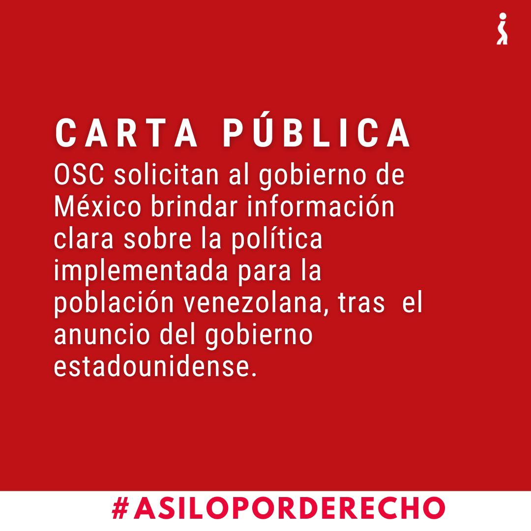 Con este preámbulo, las organizaciones dirigieron una carta pública al Presidente de México Andrés Manuel López Obrador, el Secretario de Relaciones Exteriores, Marcelo Ebrard y el Secretario de Gobernación Adán Augusto López Hernández. En ésta expusieron que les toma por sorpresa que “México haya tomado una decisión soberana para recibir a un mayor número de personas y nacionalidades expulsadas de los Estados Unidos, sabiendo que las expulsiones bajo Título 42 violan el marco normativo estadounidense, el cual garantiza el acceso al asilo independientemente de la forma de llegar”, ya que todas las personas, de todas las nacionalidades, tienen el derecho garantizado de solicitar asilo, tanto en México como en Estados Unidos.