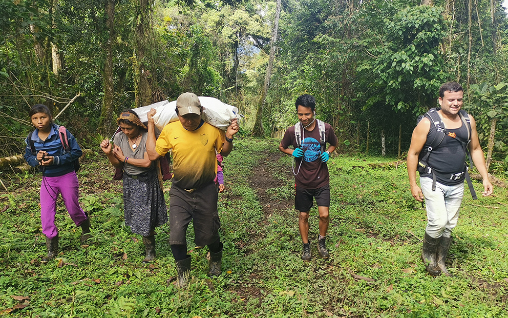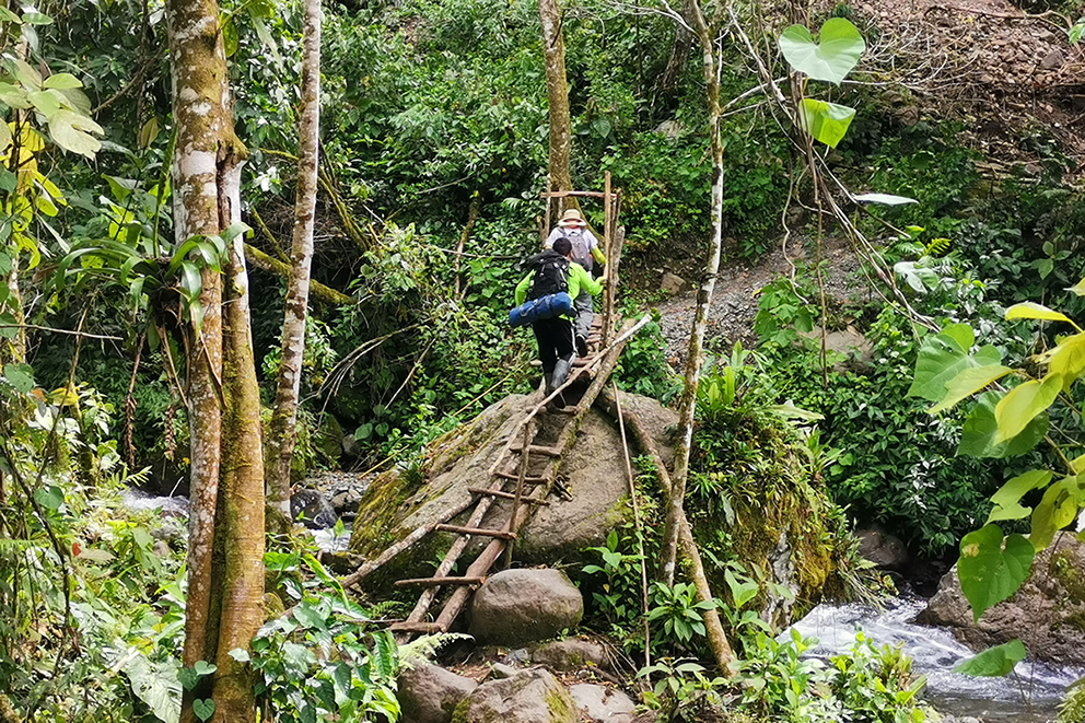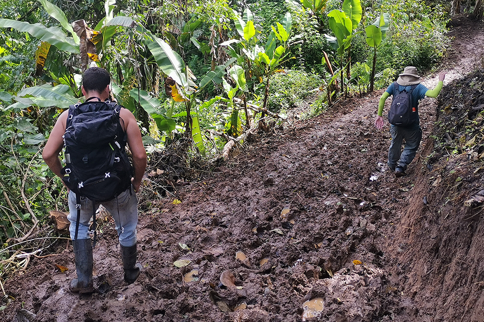 El fango del camino es tan pesado que succiona los pasos, a veces el calzado se queda tragado por el barro. Pasamos puentes de madera endebles, por debajo ríos nutridos y prístinos. En algún momento arrojo la mochila y me rindo al paso de Randy y Omar. Con la promesa de que ya no va a mentir Randy me asegura que ahora sí falta media hora. El maestro y el ingeniero han hecho tan a menudo el camino que lo hacen sin asomo de cansancio. Para llegar a la escuela Randy utiliza un día de trabajo, da clases y dirige el colegio tres días, luego utiliza otro día para volver a su casa.