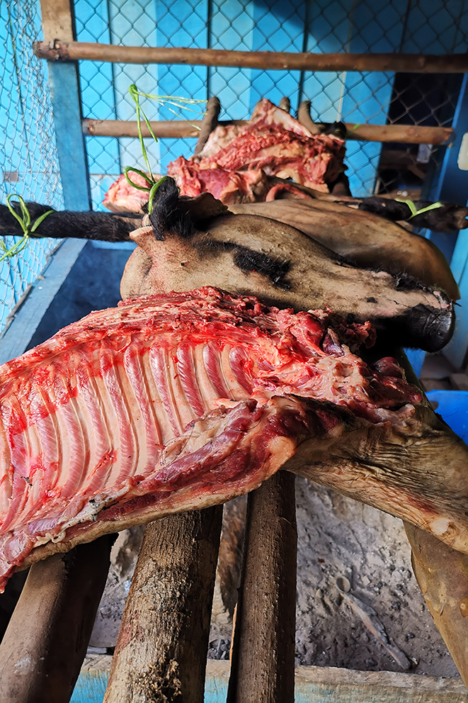 La atención del pueblo está centrada en el chancho que mataron por la tarde, la gente del lugar rehúye tanto a las cuestiones de sangre que extinguen a los animales por asfixia. Cenamos en la escuela mientras el chancho se ahúma en el fogón donde hierve el café.