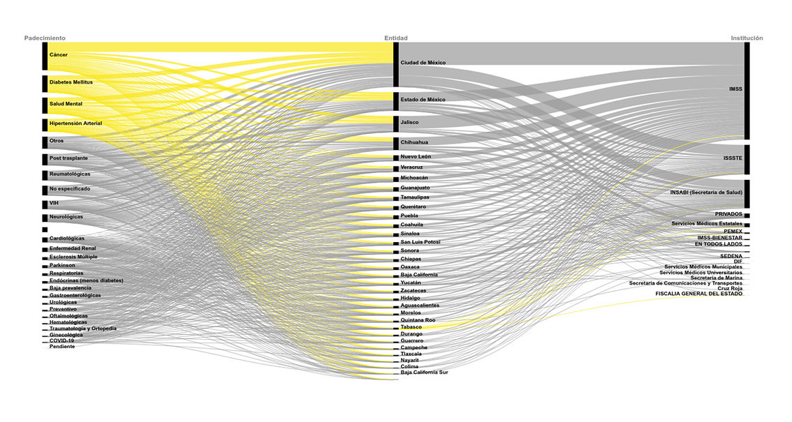 Tras un análisis de la base de datos proporcionada por Nosotrxs realizado por PODER, se pueden explicar algunos de los fenómenos en materia de abastecimiento que están ocurriendo en el estado de Tabasco; por ejemplo (al igual como ocurrió en otros estados de la república), enfermedades progresivas como el VIH o el cáncer fueron las más afectadas por la falta de medicinas durante la pandemia por covid-19.
