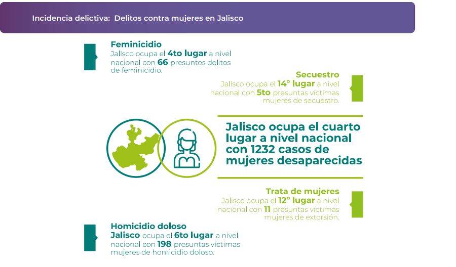 Lamentablemente, Jalisco también ocupa uno de los primeros lugares como la entidad con mayor número de presuntos delitos de feminicidio en el país. Hasta 2020, era la sexta entidad nacional con 66 casos, lo que representa el 7.02% de los 940 casos nacionales registrados.