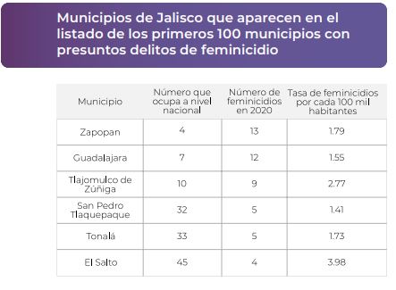 Zapopan, Guadalajara, Tlajomulco de Zúñiga, San Pedro Tlaquepaque, Tonalá y El Salto son los municipios del estado que aparecían hasta 2020 entre los primeros 100 con más presuntos delitos de feminicidio registrados en el país.