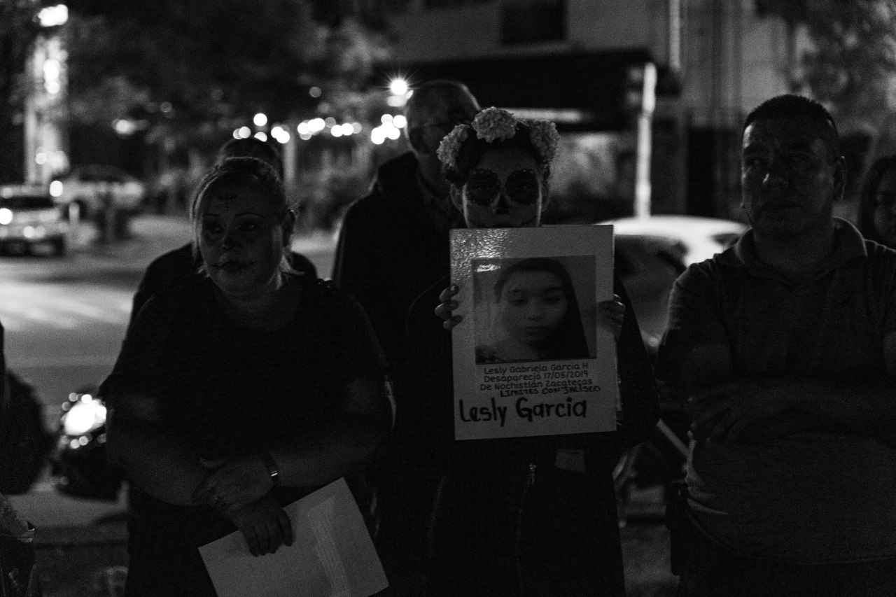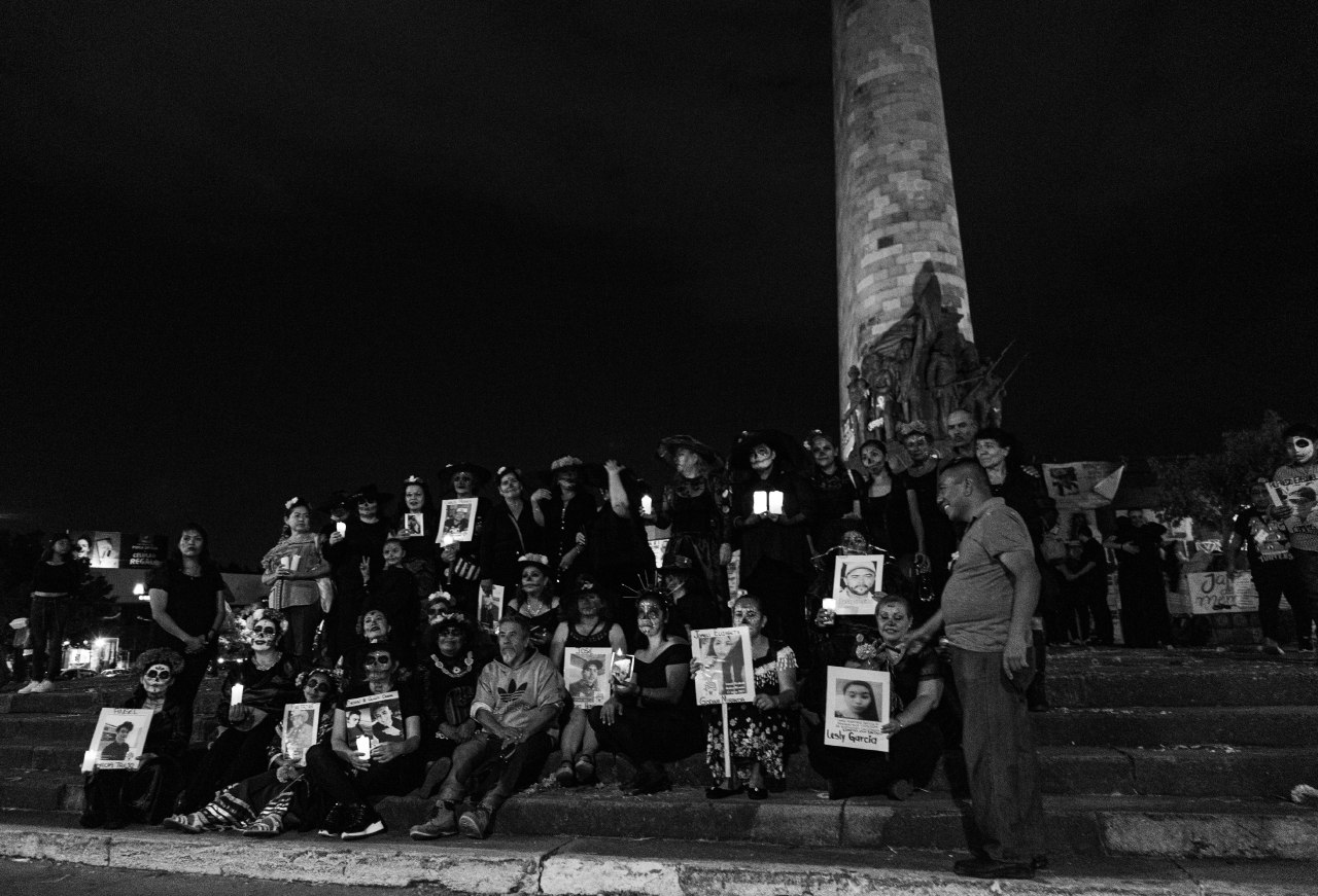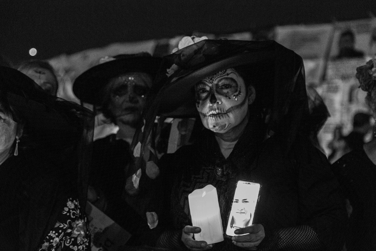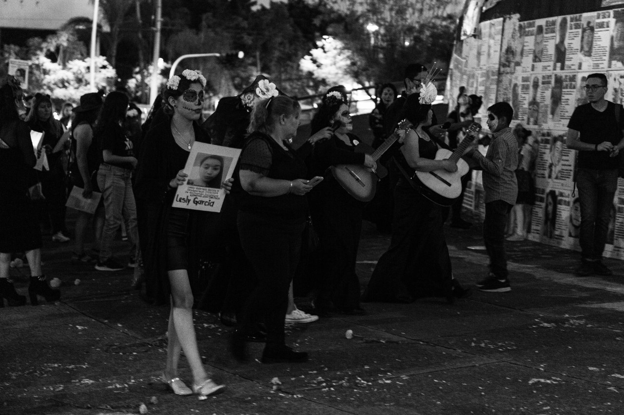 Disfrazadas de catrinas, las integrantes de Familias Unidas por Nuestros Desaparecidos Jalisco (FUNDEJ) se congregaron en la Glorieta de las y los Desaparecidos para realizar una acción de memoria por todas las personas que nos faltan y por todas aquellas que están bajo el resguardo del Instituto Jalisciense de Ciencias Forense a la espera de ser identificadas.