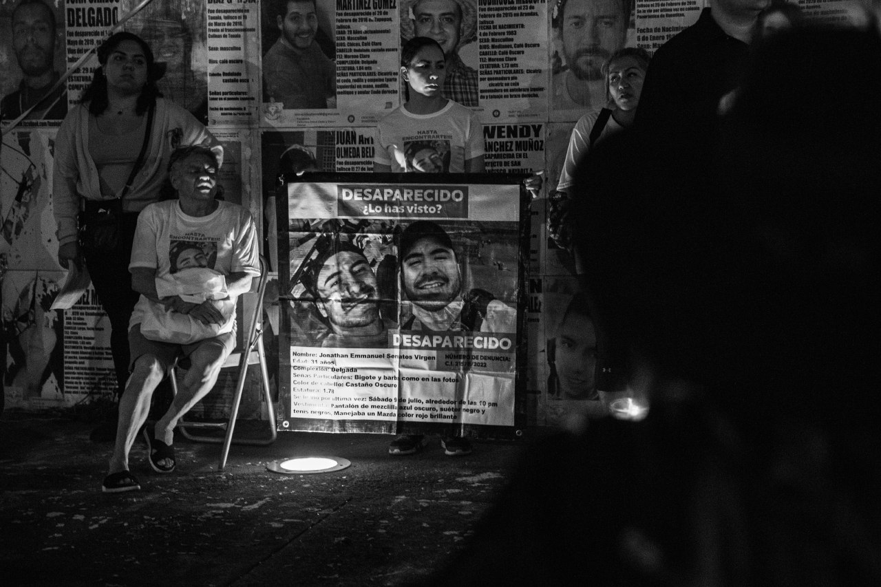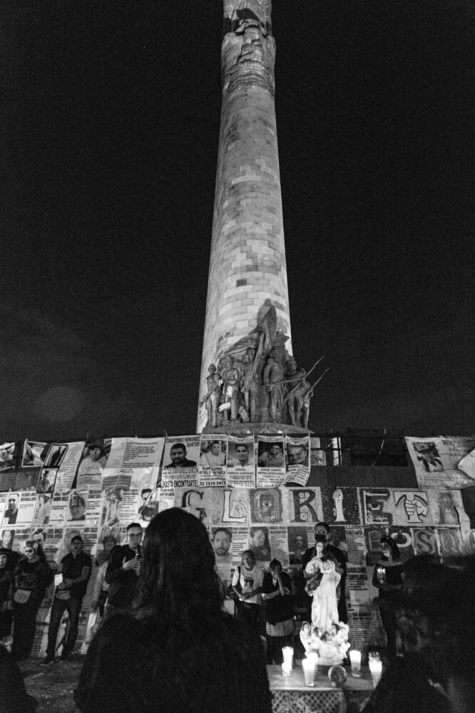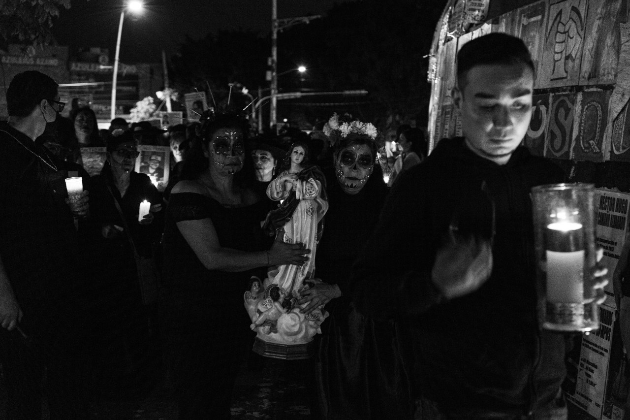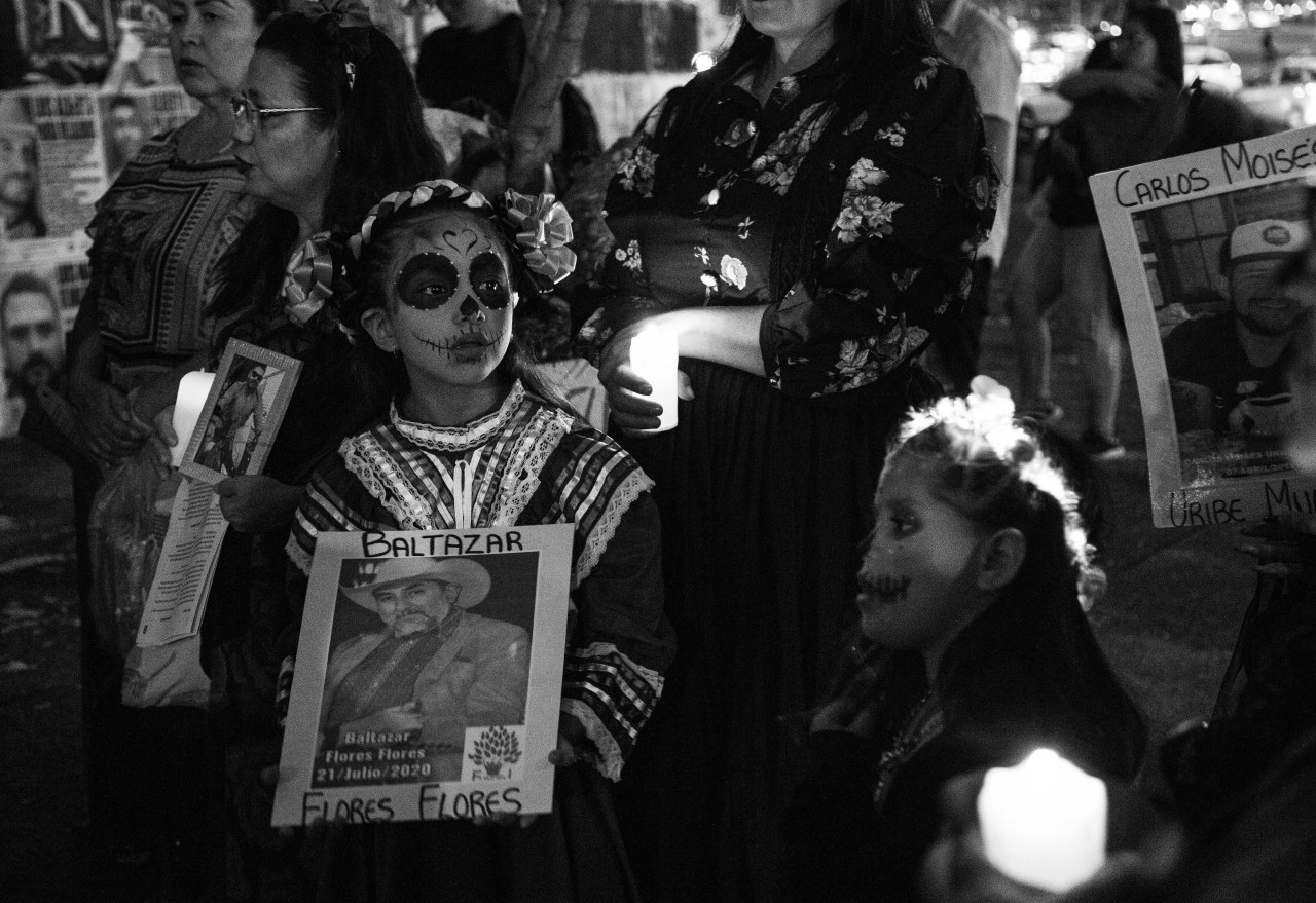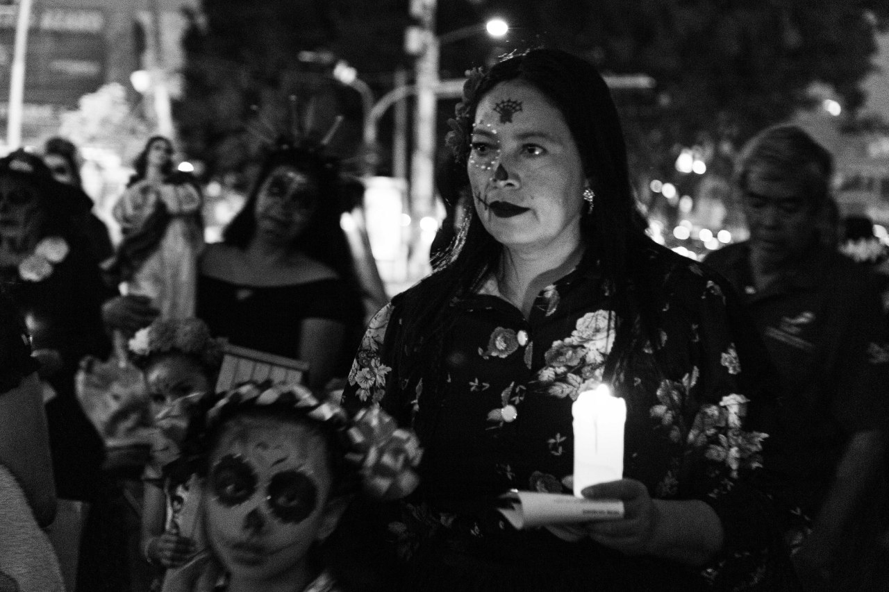 Disfrazadas de catrinas, las integrantes de Familias Unidas por Nuestros Desaparecidos Jalisco (FUNDEJ) se congregaron en la Glorieta de las y los Desaparecidos para realizar una acción de memoria por todas las personas que nos faltan y por todas aquellas que están bajo el resguardo del Instituto Jalisciense de Ciencias Forense a la espera de ser identificadas.