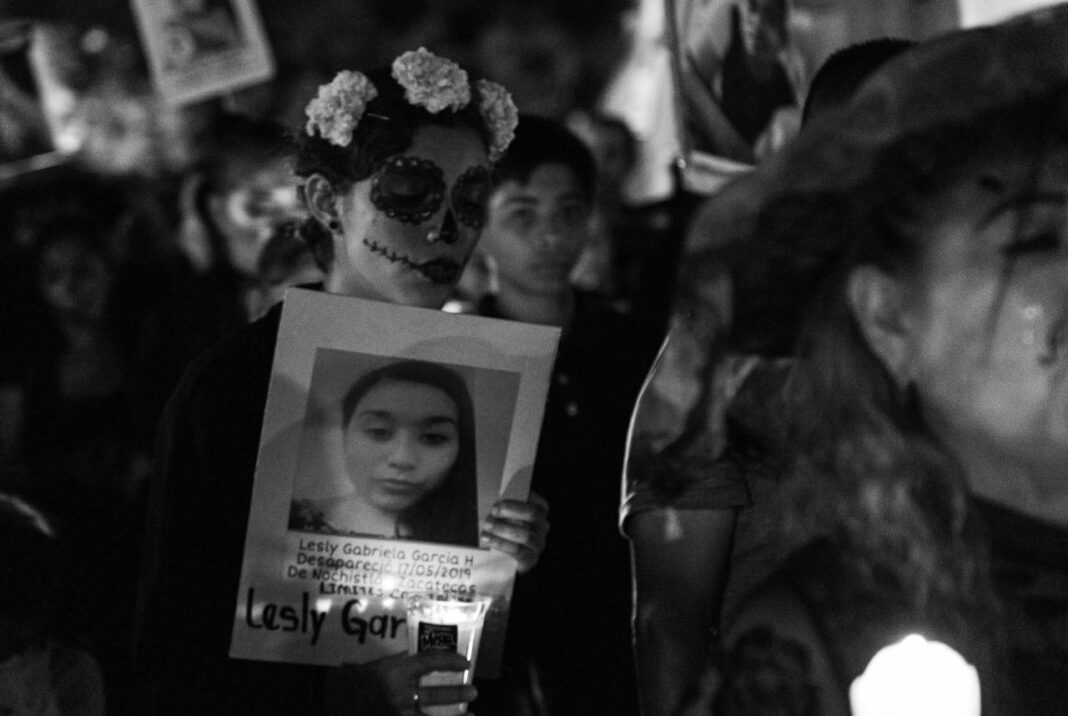 Disfrazadas de catrinas, las integrantes de Familias Unidas por Nuestros Desaparecidos Jalisco (FUNDEJ) se congregaron en la Glorieta de las y los Desaparecidos para realizar una acción de memoria por todas las personas que nos faltan y por todas aquellas que están bajo el resguardo del Instituto Jalisciense de Ciencias Forense a la espera de ser identificadas.