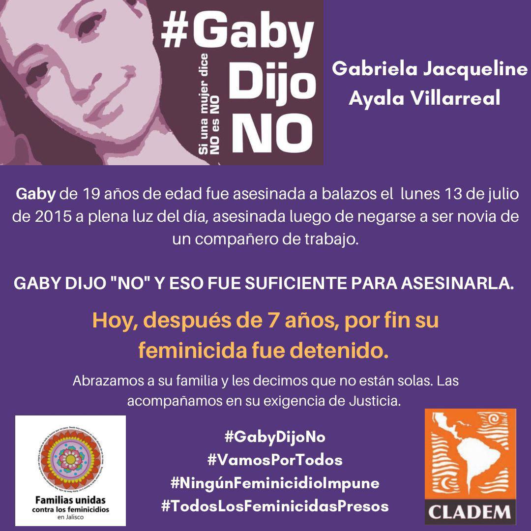 “Hoy dos feminicidas están en la cárcel” manifestó CLADEM Jalisco en su anunció, sin embargo, dejaron en evidencia el largo tiempo transcurrido entre los feminicidios de ambas jóvenes y la captura de sus agresores: en el caso de Gaby siete años después de los hechos y al segundo 331 días (casi un año) después de arrebatarle la vida a María.