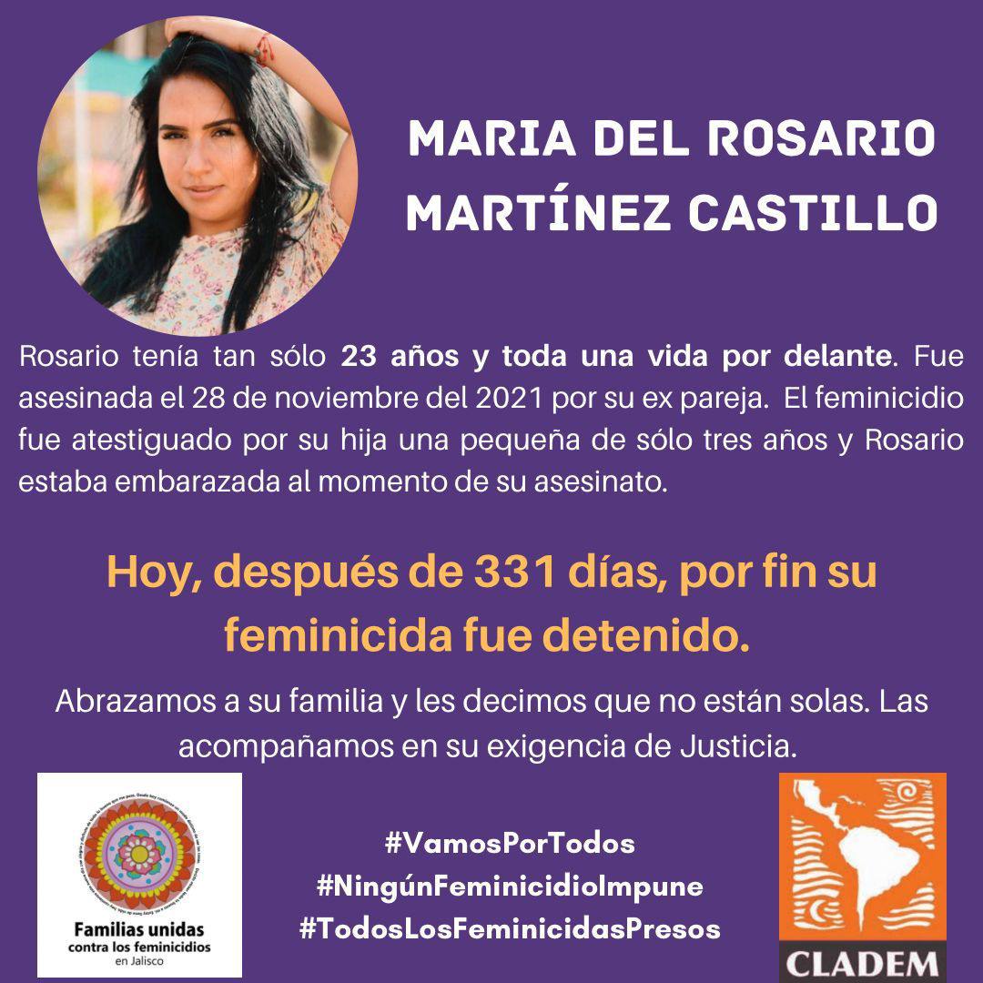 Reconociendo lo anterior, CLADEM Jalisco emitió un comunicado en donde celebró la aprehensión del feminicida de Gabriela Jacqueline Ayala Villareal, asesinada el 13 de junio de 2015 al negarse a ser novia de este hombre que era su compañero de trabajo, así como la detención del feminicida de María del Rosario Martínez Castillo, asesinada el 28 de noviembre de 2021 por su expareja. Los feminicidas fueron capturados los días 25 y 26 de octubre, respectivamente.