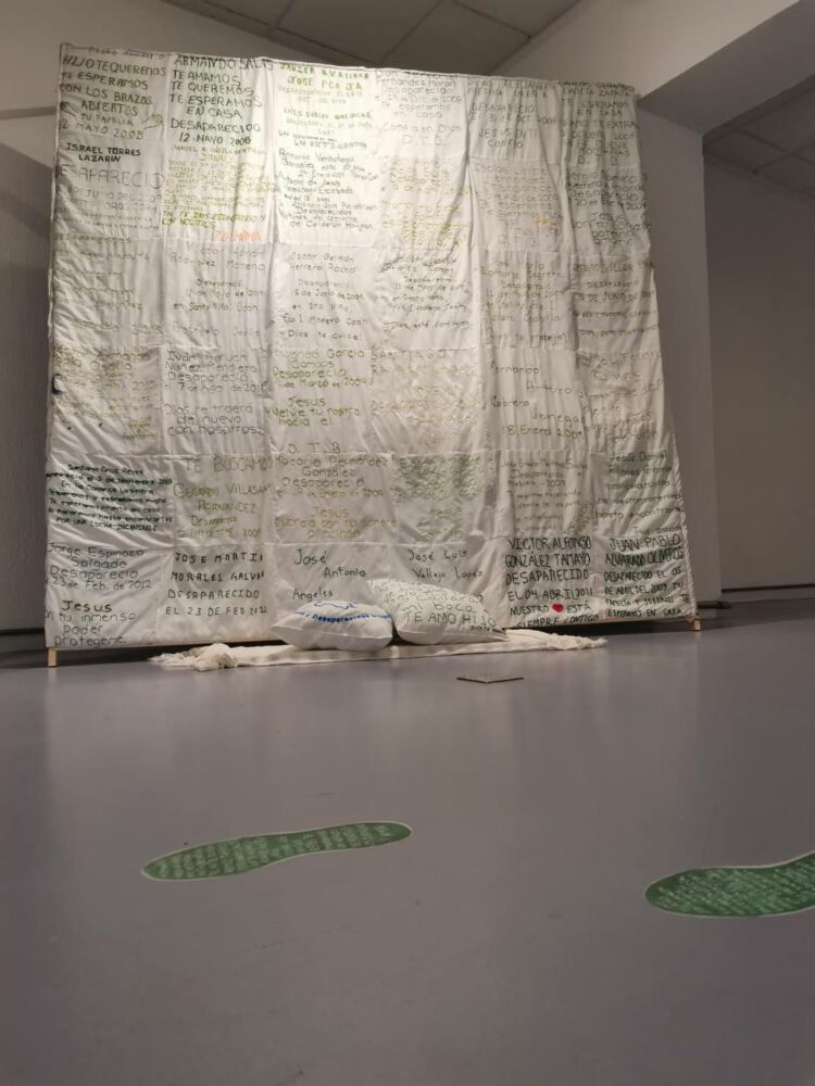 Asimismo, se exhibe la colcha bordada de manera colectiva por el colectivo funden Fuerzas Unidas Por nuestros Desaparecidos Nuevo León y Fuerzas Unidas por Nuestros Desaparecidos Coahuila.
