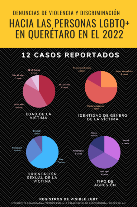 La violencia trasciende a la sociedad. Visible LGBT es una herramienta colaborativa perteneciente a la organización no gubernamental AMICUS DH, A.C. que registra y contabiliza denuncias de violencia y discriminación contra las personas LGBT+ en México. Querétaro ha registrado más de diez denuncias en 2022, en las que sobresalen como víctimas los hombres gay cisgénero mayores de 18 años, en espacios públicos y privados, con agresiones verbales.