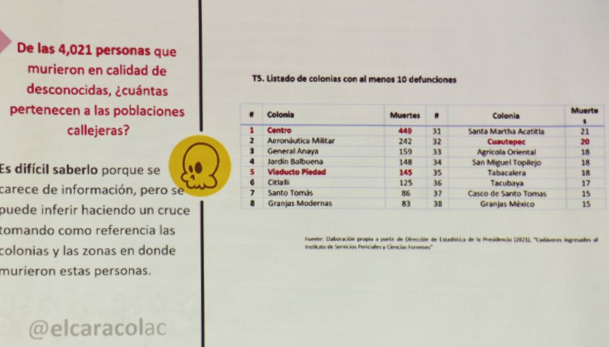 El Caracol advierte que no es un dato contundente, sino una inferencia a partir de los datos con los que cuentan. A la vez, denuncian que han pedido solicitudes de información sobre cuántas personas murieron por covid en los CAIS y en la calle, pero hasta el momento las dependencias gubernamentales no les han contestado.