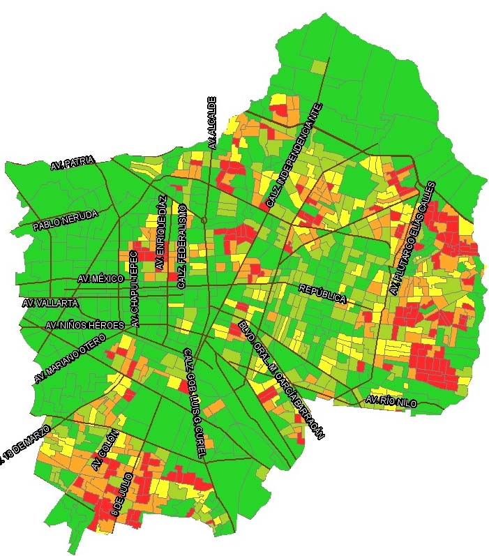Una mirada a la distribución geográfica de esos “desiertos urbanos” revela que no todos son creados iguales; a pesar de que este sea un problema que afecta a más de la mitad de la población en la ciudad, las zonas con menos acceso a las áreas verdes revelan un patrón de marginación y desigualdad. Las zonas más afectadas por esta crisis ambiental geo-demográfica son Oblatos, Tetlán, y la zona de Miravalle. Todos estos “puntos rojos” se encuentran entre las zonas con más marginación en Guadalajara, en un arco que va de media en Tetlán, a alta en partes de Tlaquepaque, y a muy alta en Oblatos.
