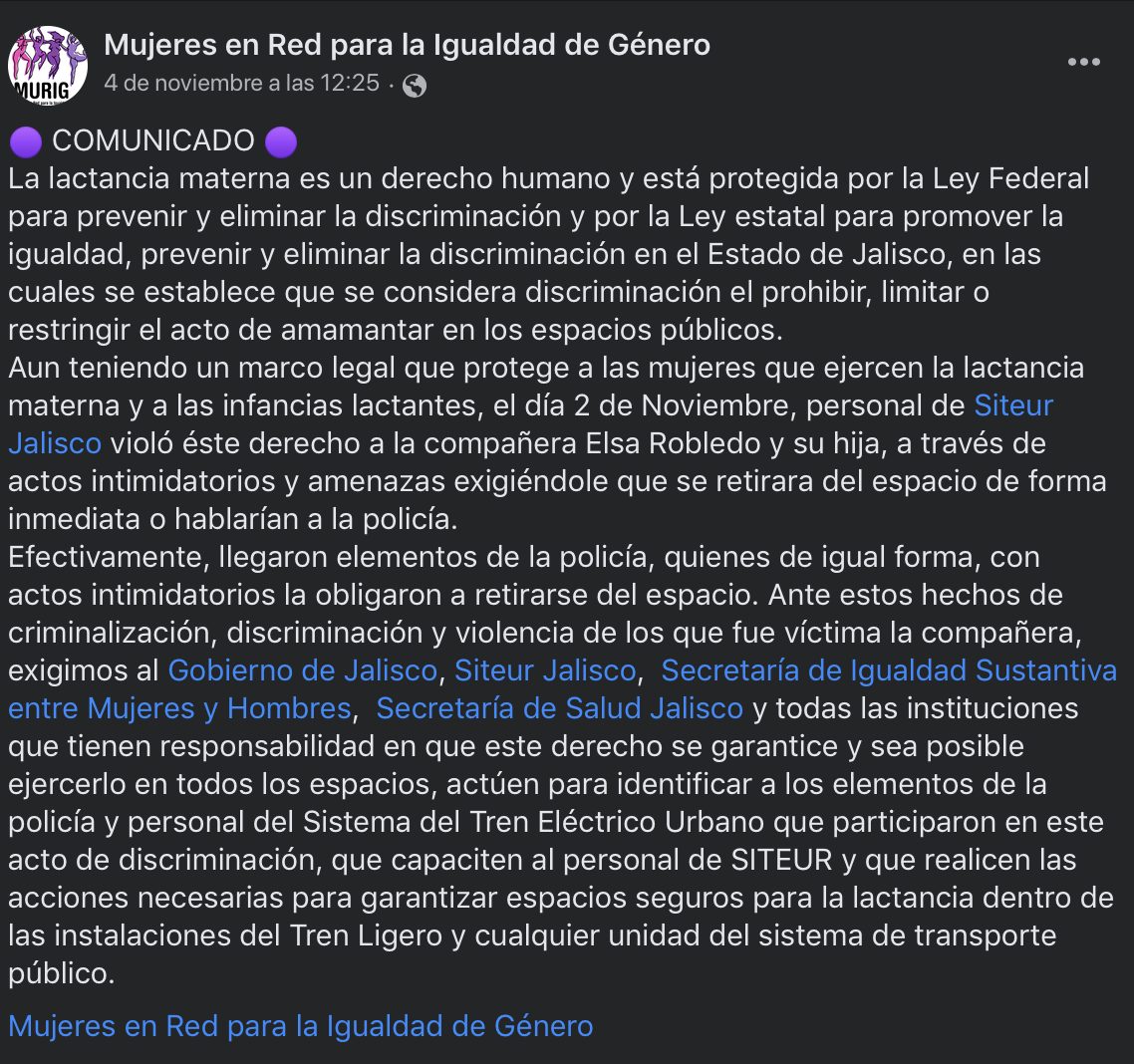 El pasado 2 de noviembre, una madre fue intimidada y amenazada por personal del Sistema de Tren Eléctrico Urbano Jalisco, mientras amamantaba a su hija de dos años en las instalaciones de este medio de transporte público.