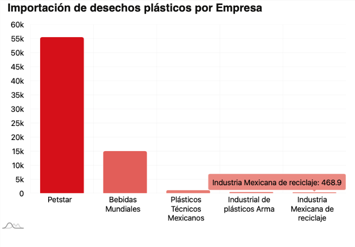 La Industria Mexicana de Reciclaje importó 468 toneladas, Industrial de Plásticos Arma, 573 toneladas; mientras que Plásticos Técnicos Mexicanos, introdujo al país mil 200 toneladas. Por su parte, Bebidas Mundiales importó 15 mil 119 toneladas de desechos plásticos entre 2021 y 2022.
