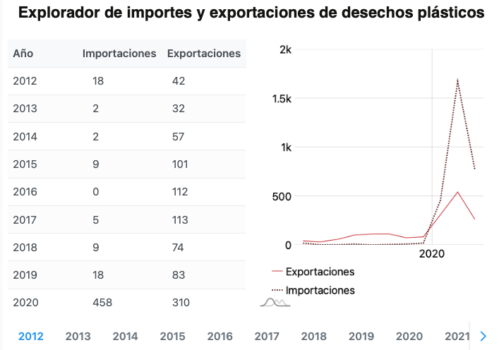 Los primeros tres años importó 58 toneladas, al año siguiente no se registró ingresos, pero en 2020 adquirió 10.586 toneladas y en 2021 fueron 31.964 toneladas de desperdicios de PET (polietileno tereftalato, es un tipo de plástico utilizado en envases y botellas de gaseosa, agua y aceite, entre otros). Hasta el 30 de septiembre de 2022 había importado 13.113 toneladas.