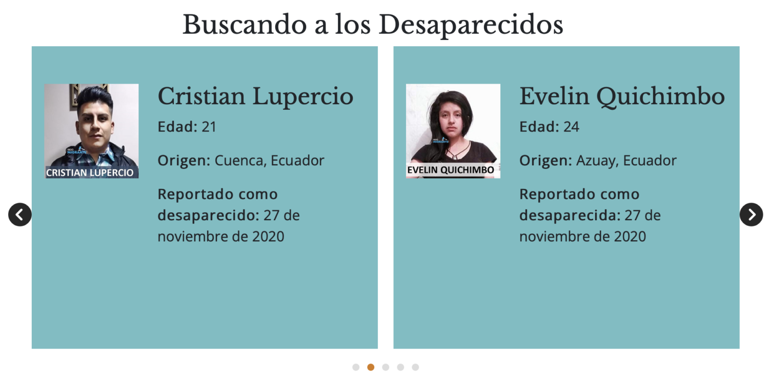 Se trata de Carlos Eduardo López Quinapanta, de 35 años, quien desde el 8 de abril de 2020 desapareció; Jimmy Washington Morocho Reinoso, con quien se tuvo el último contacto el 4 de noviembre; así como de Cristian Lupercio, de 21 años, y Evelin Quichimbo, de 24 años, de quienes no se sabe nada desde el 27 de noviembre de ese año.