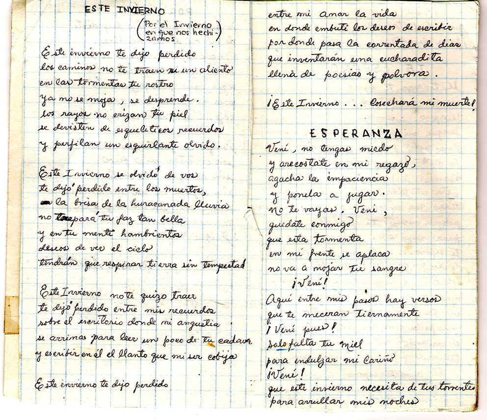 Y Leyla, en la última página, hacía sus poemitas a los diez años. Allá en la escuela y yo no me daba cuenta. Pero una vez me puse a ver sus cuadernos y esta niña haciendo poemitas de amor, de ilusiones, platónicos.