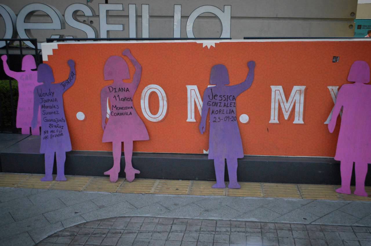 Siluetas de cartón de color rosa y morado que representan a las niñas y mujeres asesinadas en México fueron colocadas como acto de protesta en las letras monumentales de la Feria Internacional del Libro (FIL) en Guadalajara, Jalisco.