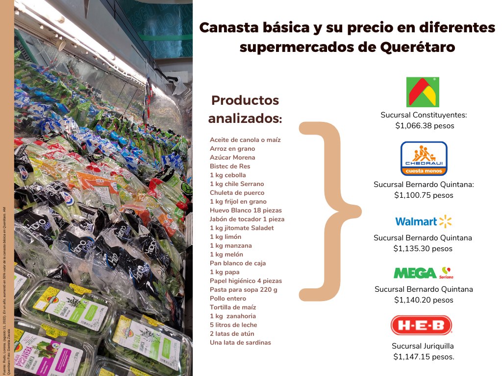 El salario mínimo en México es de 172.81 pesos diarios, según la Comisión Nacional de los Salarios Mínimos. Si multiplicamos esto por 15, que representan los días correspondientes a una quincena laboral, nos da 2,592.15 pesos. En la siguiente infografía, se observa el precio de la canasta básica en diferentes supermercados de la ciudad.