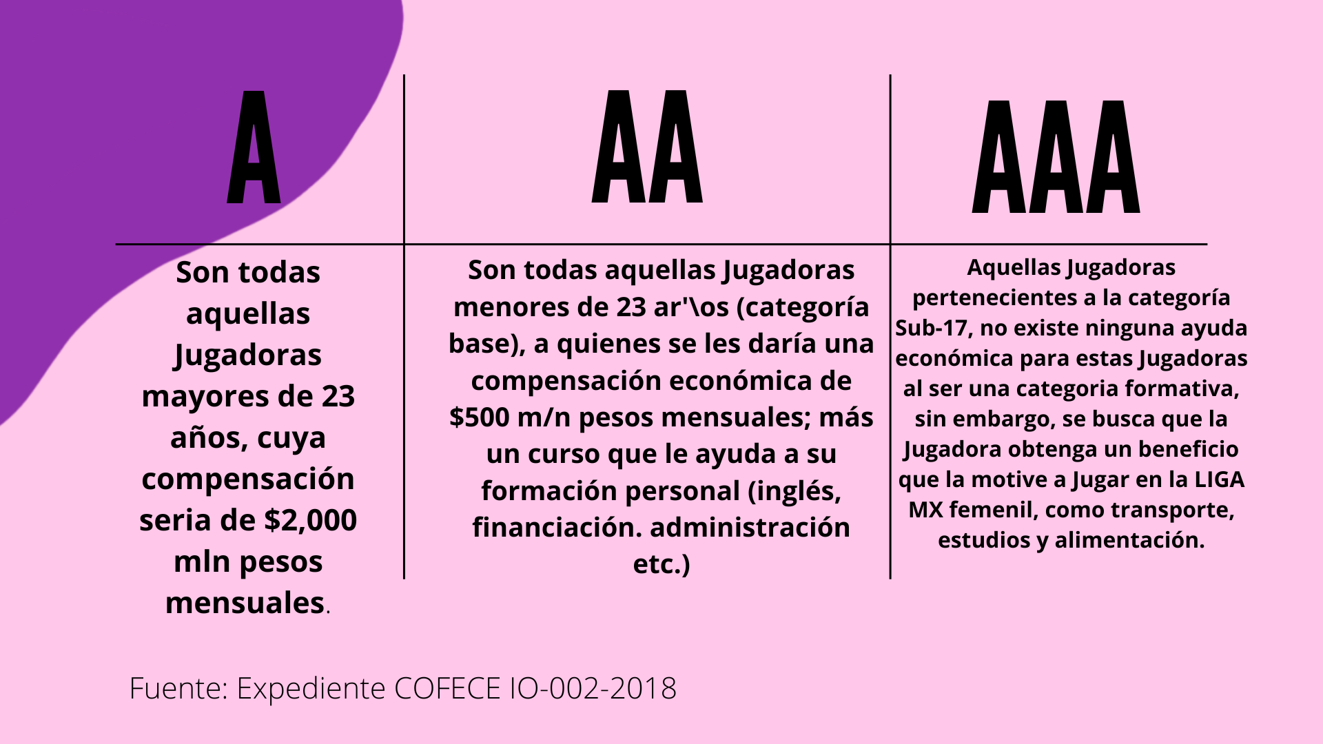 El tope salarial al que se refiere Paola es aquel que impusieron los equipos para que las futbolistas no ganaran más de dos mil pesos mensuales, esto conforme a un tabulador en que las deportistas se clasificaban en tres categorías: i) las mayores de 23 años ganarían un máximo de 2 mil pesos; ii) las menores de 23 años, 500 pesos más un curso para su formación personal y iii) las jugadoras de la categoría Sub-17 no tendrían ingresos, pero podrían tener ayuda de transporte, estudios y alimentación.
