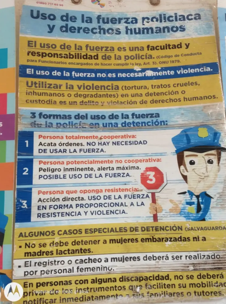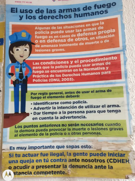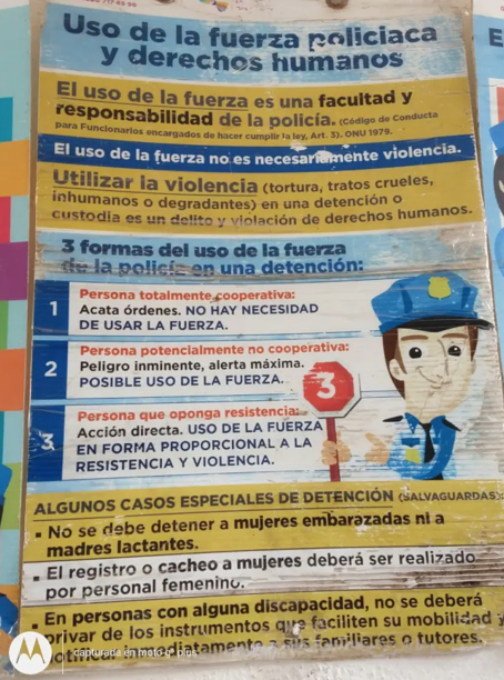 Entre otros cómics en forma de carteles, existen aquellos en los que se advierte a los elementos de la Policía municipal que no se debe hacer uso de la fuerza pública si no es necesario.