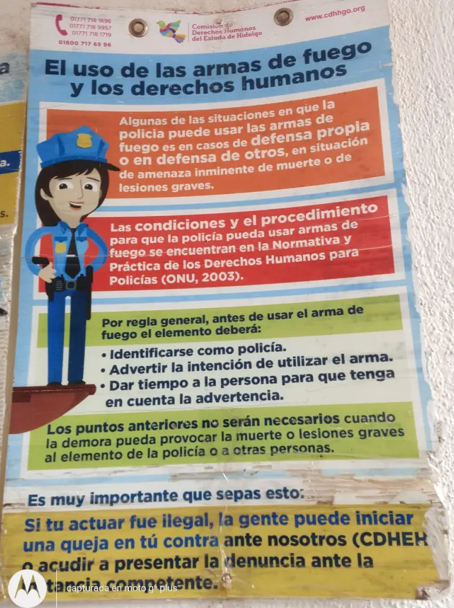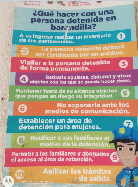 Huehuetla es un caso aparte. Consultado respecto a si cuenta con un reglamento específico de barandilla, a través de una solicitud de información respondió que no, pero que para tales efectos se guiaba con los carteles que proporciona la Comisión de Derechos Humanos del Estado de Hidalgo (CDHEH), que es un decálogo de los pasos a seguir.