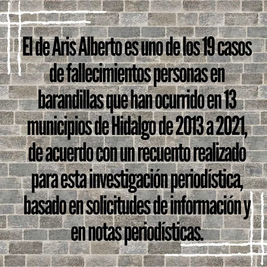 El deceso de Aris Alberto es uno de los 19 casos de muertes en Áreas de Retención Primaria —conocidos también como galera o barandilla— que han ocurrido en 13 municipios de Hidalgo de 2013 a 2021, de acuerdo con un recuento realizado para la realización de este reportaje, basado en solicitudes de información y en notas periodísticas publicadas por este medio.